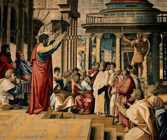 "바울이 아덴에서 그들을 기다리다가 그 성에 우상이 가득한 것을 보고 마음에 격분하여 회당에서는 유대인과 경건한 사람들과 또 장터에서는 날마다 만나는 사람들과 변론하니 ······ 바울이 아레오바고 가운데 서서 말하되 아덴 사람들아 너희를 보니 범사에 종교심이 많도다. 내가 두루 다니며 너희가 위하는 것들을 보다가 알지 못하는 신에게라고 새긴 단도 보았으니 그런즉 너희가 알지 못하고 위하는 그것을 내가 너희에게 알게 하리라. 우주와 그 가운데 있는 만물을 지으신 하나님께서는 천지의 주재시니 손으로 지은 전에 계시지 아니하시고 ······ 이와 같이 하나님의 소생이 되었은 즉 하나님을 금이나 은이나 돌에다 사람의 기술과 고안으로 새긴 것들과 같이 여길 것이 아니니라"