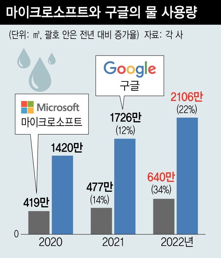 마이크로소프트와 구글의 경우 생성형 인공지능 서비스 개발 과정에서 이미 물 사용량이 크게 늘었다. 2022년 마이크로소프트의 전체 물 소비량은 640만㎥로 한해 전(477만㎥)보다 34% 급증했다. 마이크로소프트가 미국 아이오아주 디모인에 설치한 챗지피티용 최신 데이터센터의 경우 이 지역 전체 취수량의 6%에 해당하는 물을 사용했다. 2022년 구글의 전체 물 소비량도 2107만㎥로 한해 전보다 22% 증가했다.
