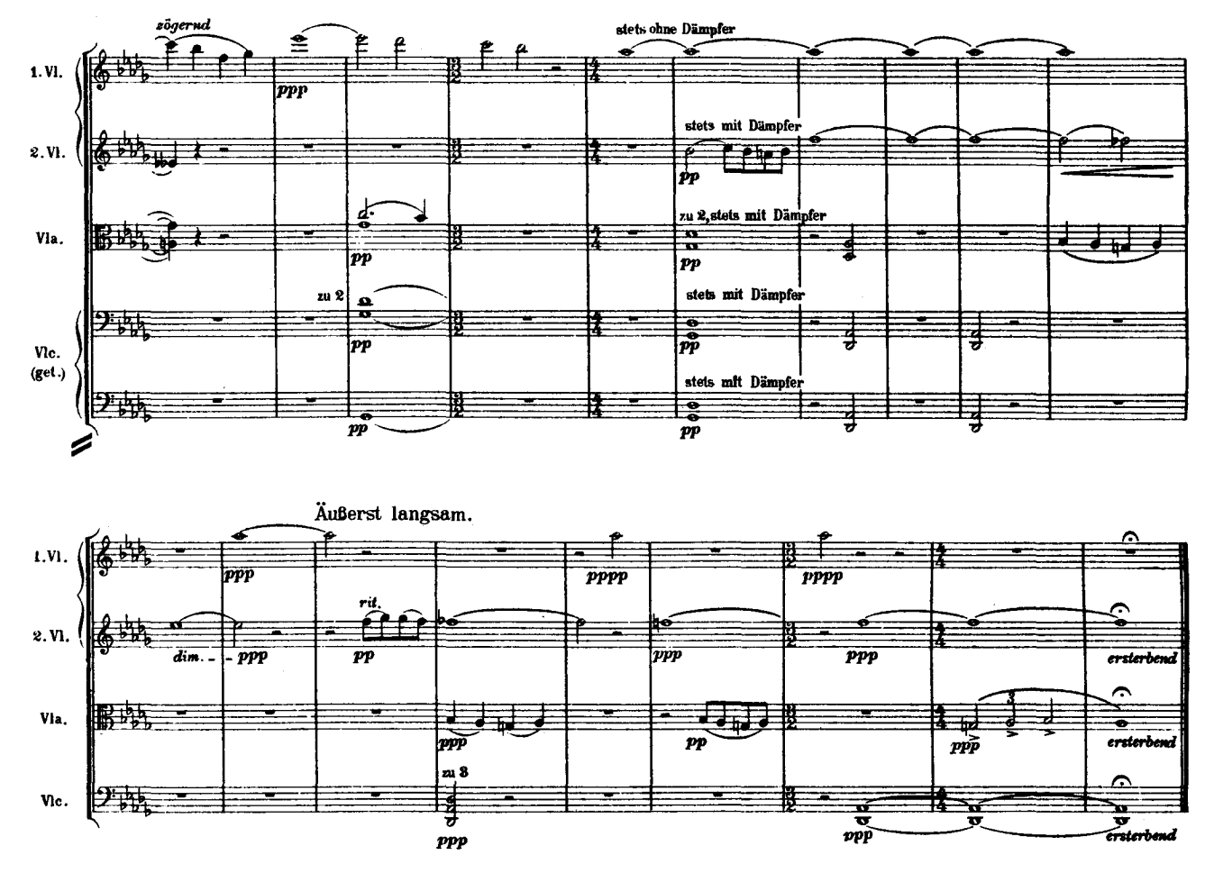 The finale of Symphony No. 9 is the slowest and most emotionally arduous movement of Mahler's work. If you look at the last page of the score, you can see that the sound of the melody, which continued for the previous 30 minutes according to the notation to play quieter and slower, gradually narrows into a web, and eventually, the musical material evaporates to the quantum level.