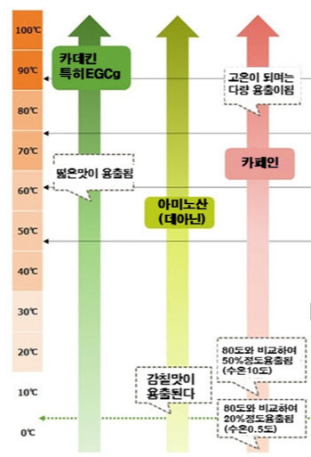 차의 맛을 결정짓는 성분인 테아닌 등의 아미노산은 낮은 온도에서도 잘 녹으며, 쓴맛의 원인이 되는 카테킨은 고온일수록 잘 녹아 나옵니다. 카페인은 80도 이상이 되면 추출량이 증가한답니다. 즉, 고온의 물에서는 쓴맛이 강한 깔끔한 녹차가, 저온의 물에서는 맛이 강한 차를 즐길 수 있죠.
