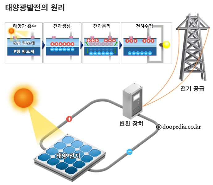 태양빛을 직접 전기에너지로 변환시키는 발전 방식이에요.