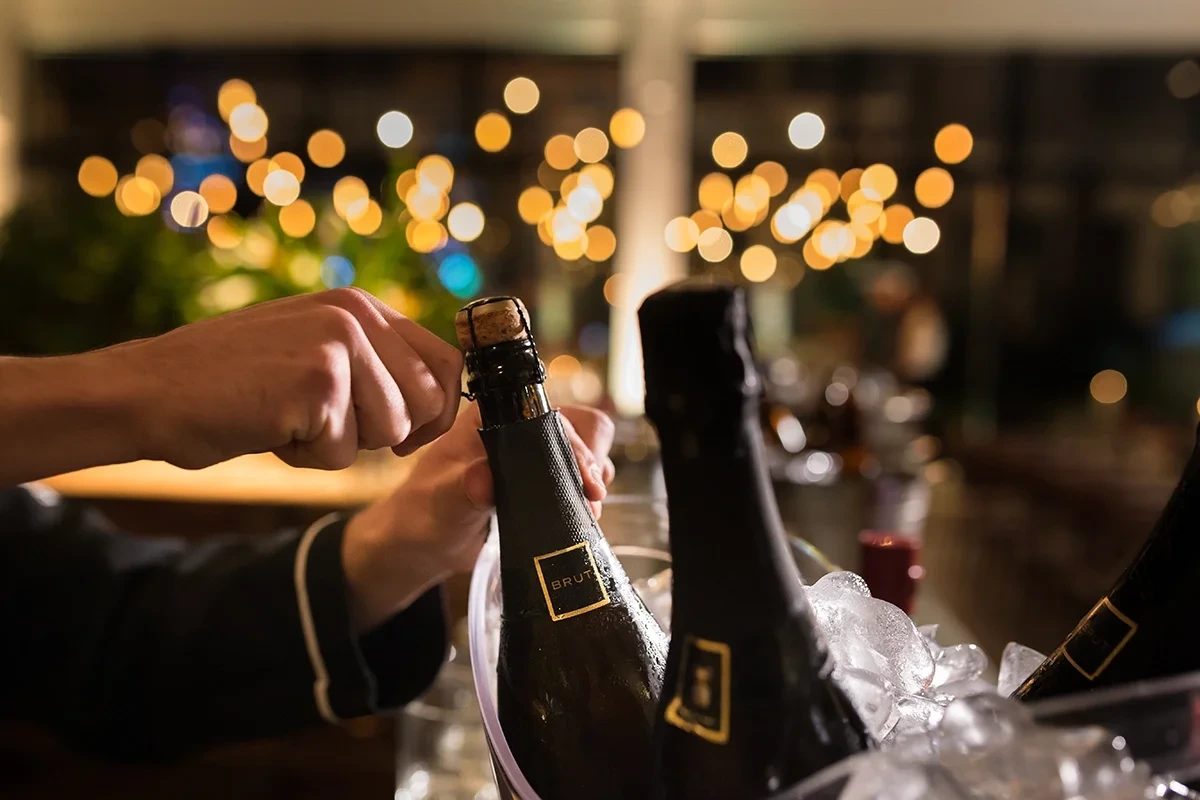 Champagne must first be cooled sufficiently before opening. Carefully release the twisted wire cord on one side after peeling off the foil on the top of the bottle. Then wrap the cork with a cloth or napkin and start turning the cork very carefully and slowly. The pressure in the bottle immediately pushes the cork up, once the cork starts to spin a little, and if this pressure is left unattended, the champagne will burst out with the sound of a bang. Therefore, in order to prevent it from erupting in this way, you must press the cork tightly from start to finish and release the stopper very carefully so that you can open the bottle without losing the foam.
