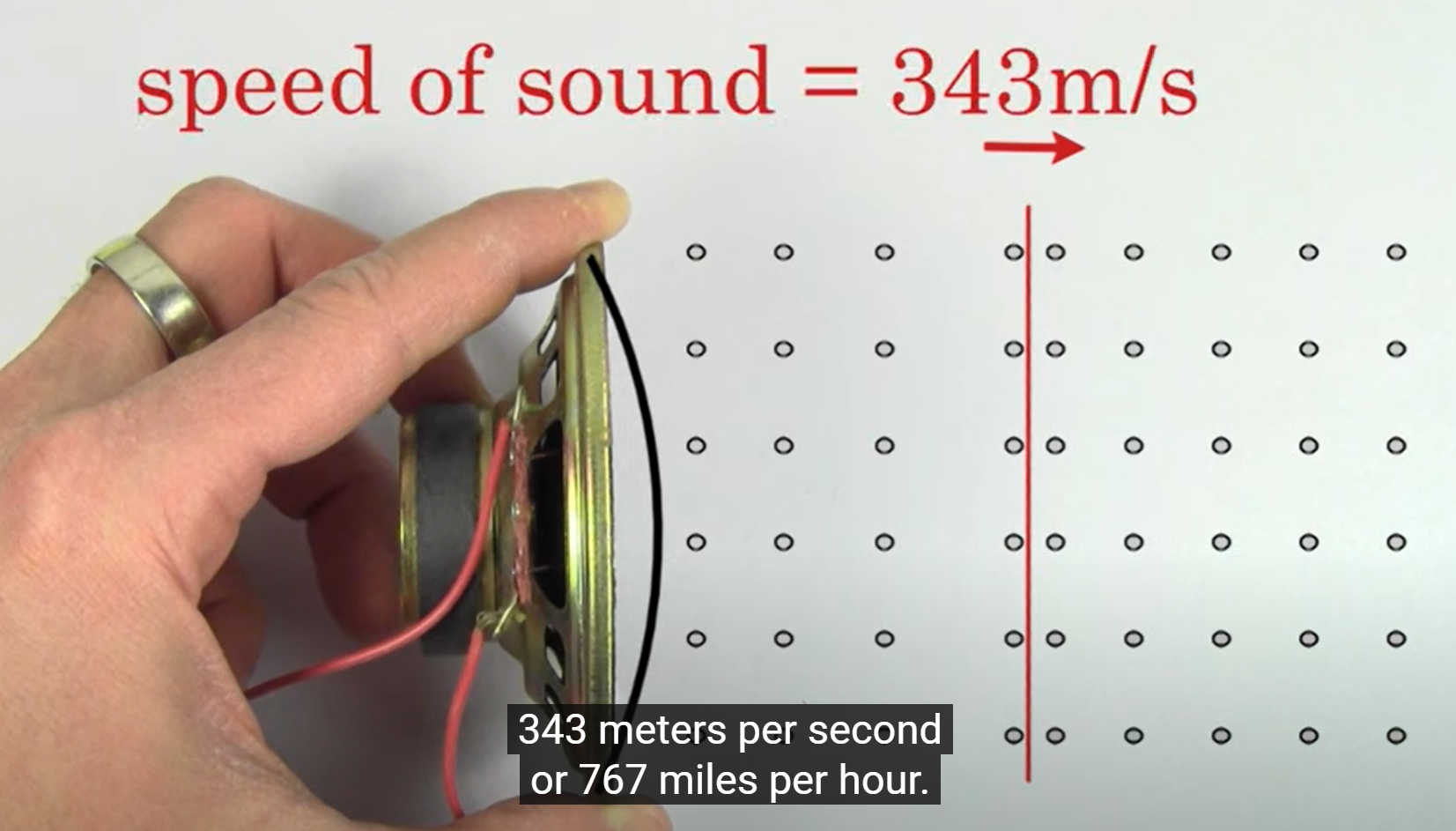 음은 제법 빠른 속도로 전파되므로 속도 측정에 약간의 계산이 필요하다. 건조한 공기 중에서 음의 속도는 실온(T=20℃)에서 초당 V20 = 344m(344m/s)로, 1km의 진행에 약 3초가 소요된다. 이것은 일상적 기준으로 보면 상당히 빠른 속도이다. 현재는 초음속 항공기가 보편적이지만, 그보다 거의 백만 배나 빠른 광속에 익숙한 물리학자들에게는 매우 느린 존재에 불과하다.