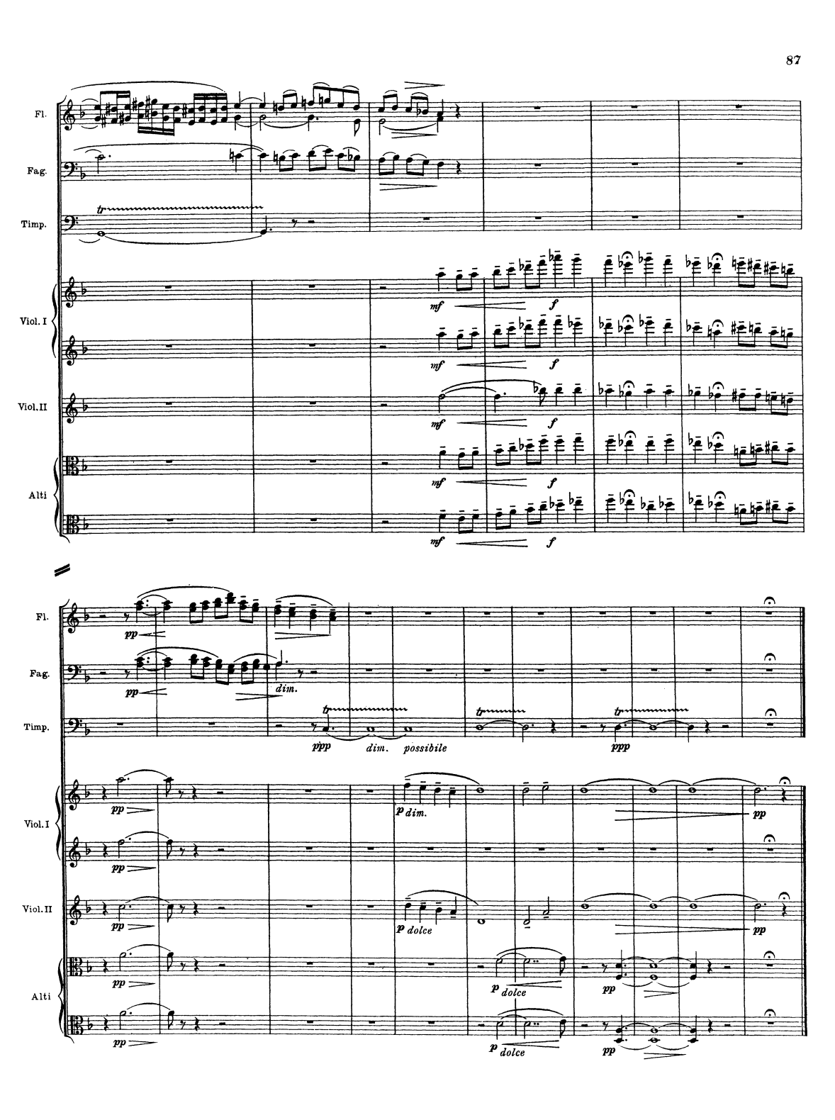 악보를 보면 시벨리우스의 말이 무슨 뜻인지 알게 된다. 첫 페이지부터 고풍스러운 다성음악과 단순한 선법이 간소한 풍경을 만들어낸다. 현악 성부들은 단 하나의 임시표에도 오염되지 않아 무채색 풍경을 이루며, 음표 머릳가 텅 빈 긴호흡의 2분음표와 온음표만이 오선지를 채우고 있다. 그야말로 음악 본연의 순백의 상태, 정지 상태를 보인다.