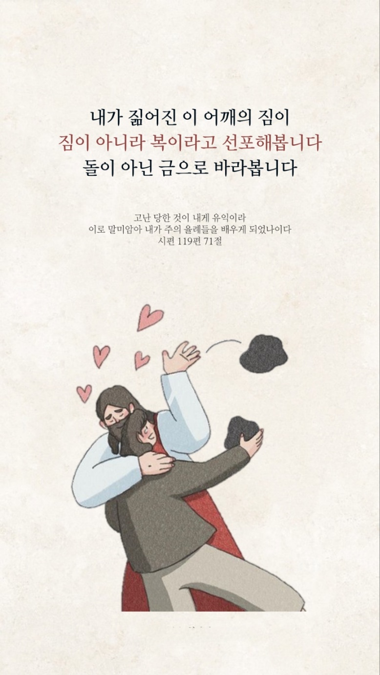우리는 누구나 고난없이 평탄하게 그러면서도 모든일이 잘 되어가고 사랑하는 사람들도 함께 건강히 행복하기를 바라죠. 그런데 때로는 예상치못한.. 도저히 이해가 되지않는 상황과 고난을 맞닥드릴때가 있습니다. 왜? 주님이 나를 사랑하지 않으시나? 그런데 고난이 오히려 유익이 될때가요. 그것은 오직 주님만이 아시고 주님께서 일하심을 우리로 알게하시는 역사가 아닐런지요. 당신을 사랑하시는 주님께서요 ~~