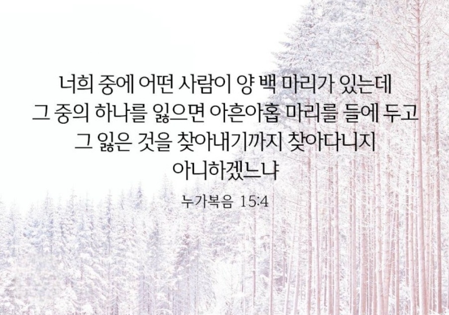 “너희 중에 어떤 사람이 양 백 마리가 있는데 그 중의 하나를 잃으면 아흔아홉 마리를 들에 두고 그 잃은 것을 찾아내기까지 찾아다니지 아니하겠느냐”(눅15:4)