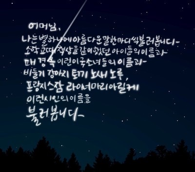 "...Mother, I call out beautiful words to each star. I call out the names of children who shared a desk in elementary school, foreign girls such as Pae (佩), Gyeong (鏡), Jade (玉), girls who have already become mothers, poor neighbors, pigeons, puppies, rabbits, mules, Francis Jam, and Lionel Maria Rilke."