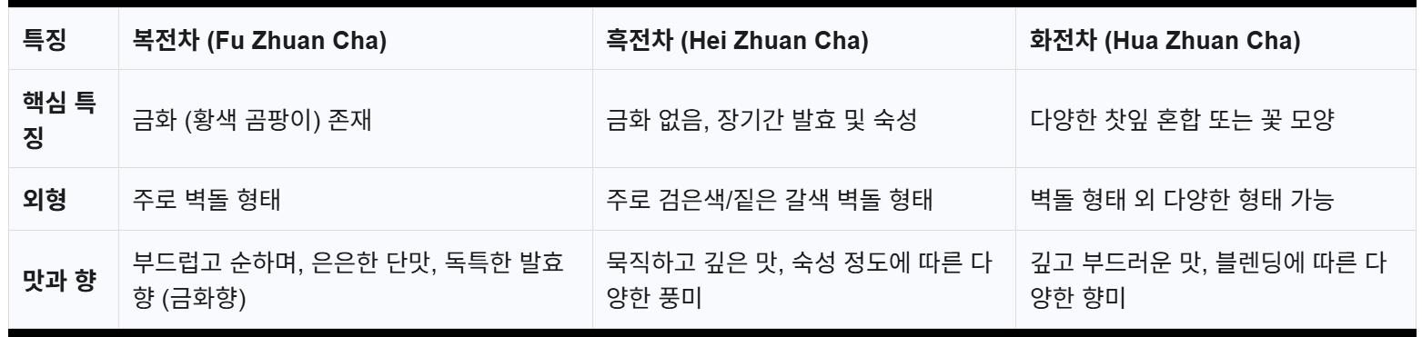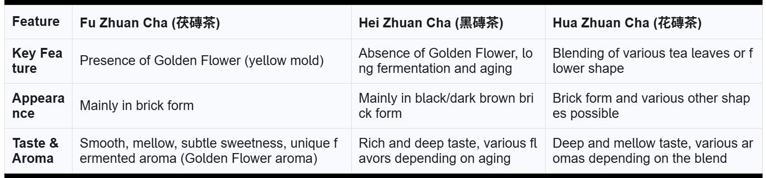 고마이계의 복전차, 흑전차, 화전차는 모두 안화 지역의 찻잎과 전통적인 제조 기술이 빚어낸 보배 같은 흑차들입니다. 겉모습은 비슷해 보여도 그 안에 담긴 공정과 맛의 결은 각각 다릅니다. 특히 복전차의 금화는 미생물과 시간이 만들어낸 걸작으로, 흑차 애호가라면 꼭 한 번 경험해볼 만한 차입니다.
