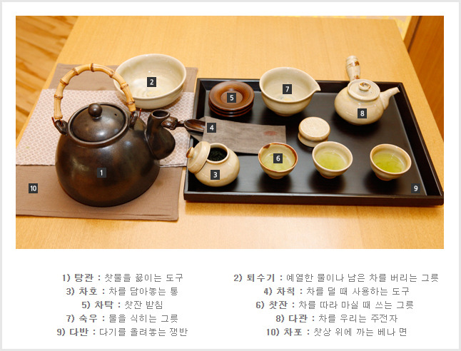 - 탕관(湯罐): 뜨거운 물을 담는 주전자. 보통 찻상의 오른쪽에 둡니다.
