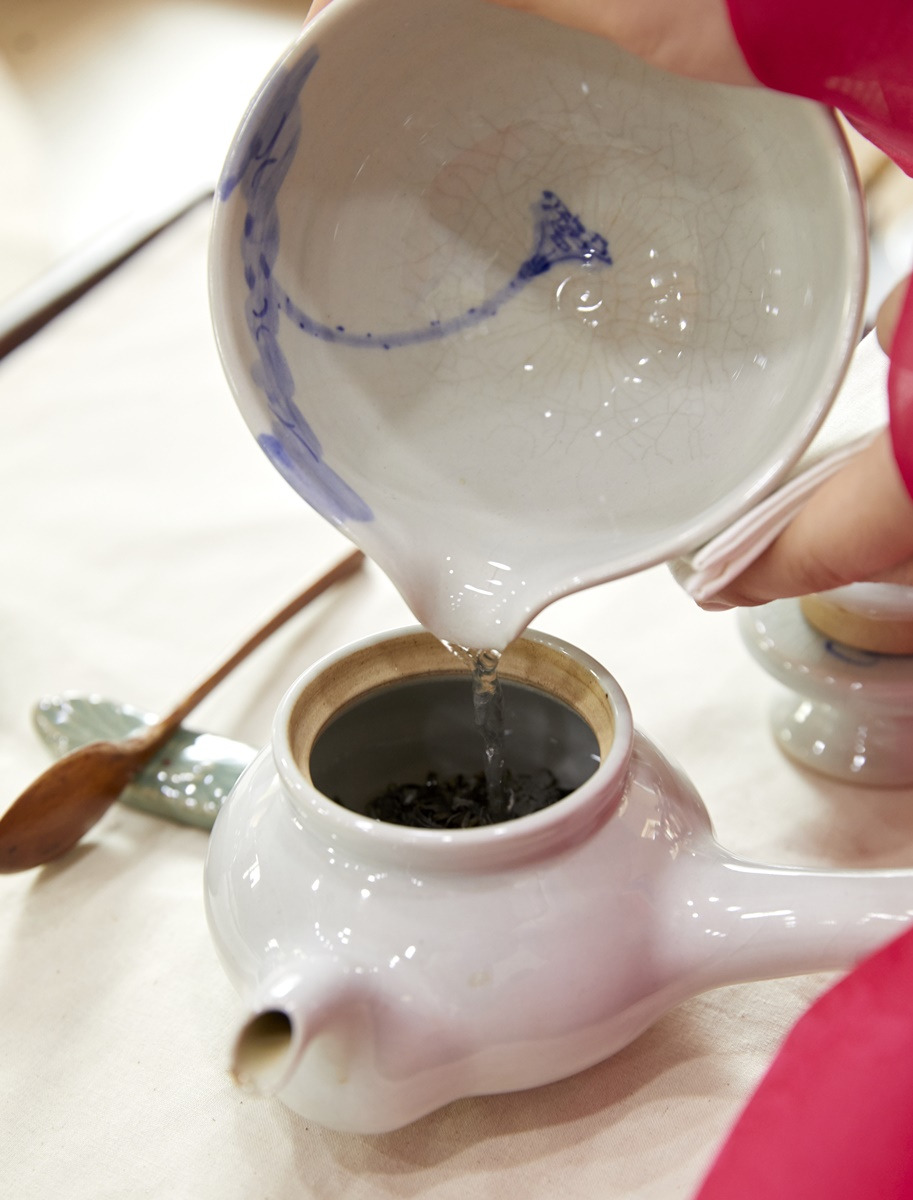 Pour freshly boiled water into the cooling bowl (sukwoo) to lower the temperature slightly. Delicate teas like green or white tea may be damaged by water that is too hot. On the other hand, fermented teas like black tea or pu-erh require high temperatures to release their full flavor.