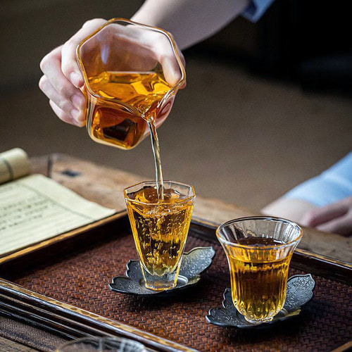 유리 다구는 차를 우릴 때 흑차의 아름다운 찻물 색깔을 그대로 감상할 수 있다는 큰 장점이 있습니다. 특히 복전차나 흑전차처럼 진하고 맑은 수색을 가진 안화흑차는 유리 다구를 통해 시각적인 즐거움을 극대화할 수 있습니다.