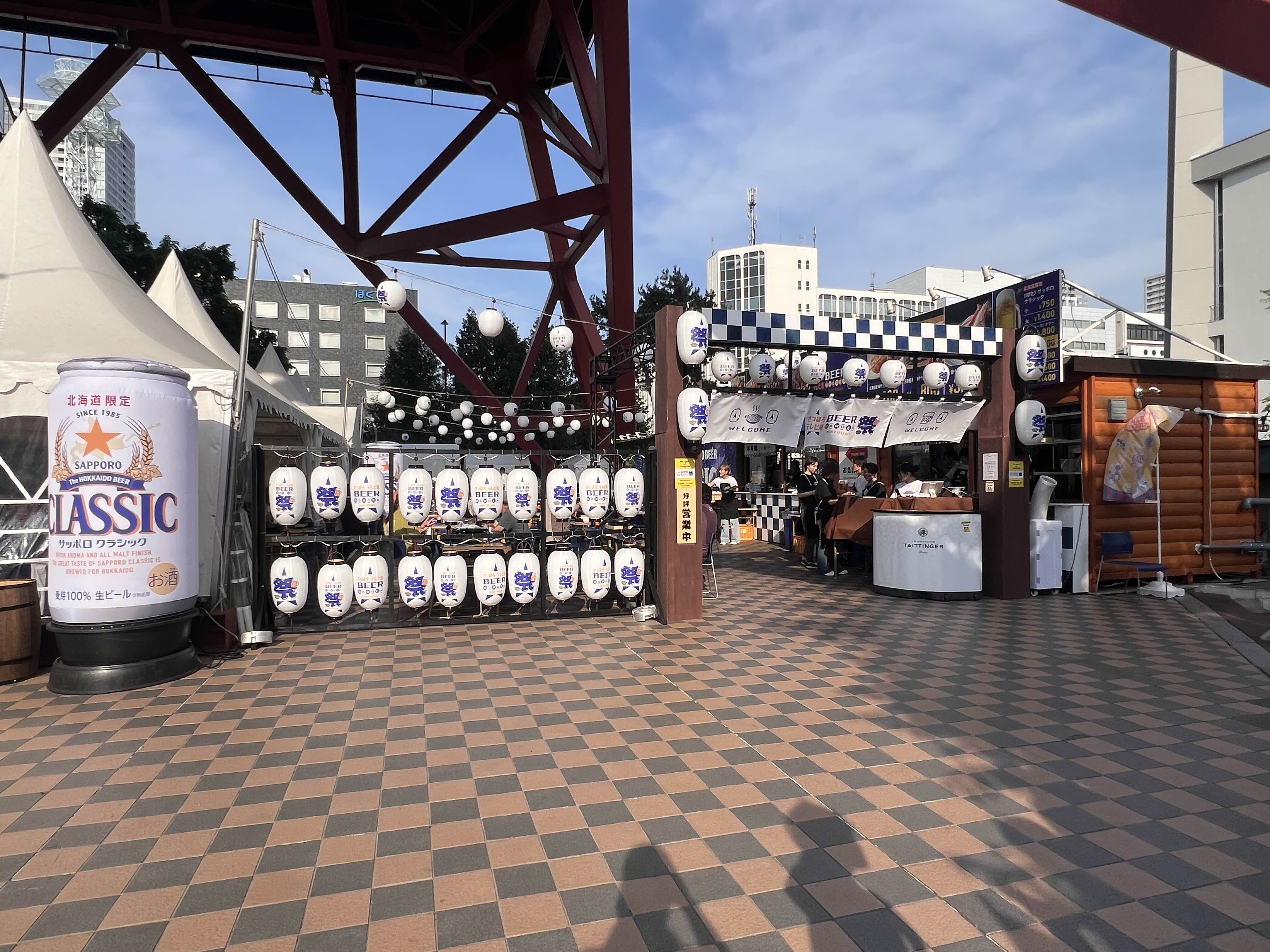 마지막으로 향한 곳은 삿포로 TV 타워였습니다. 오도리 공원 동쪽에 우뚝 솟아 있는 이 타워는 삿포로의 랜드마크 중 하나입니다. 타워 아래에는 흥미로운 풍경이 펼쳐져 있었습니다. 바로 삿포로의 대표적인 맥주인 '삿포로 클래식'을 판매하는 가판대가 마련되어 있었던 것입니다. 시원한 맥주와 함께 간단한 안주를 즐길 수 있는 공간은 많은 사람들로 북적였습니다. 저녁이 되면 더욱 활기찬 분위기가 될 것 같았습니다. 아쉽게도 아직 낮 시간이라 맥주는 다음 기회로 미루었지만, 삿포로에서의 저녁을 상상하며 잠시 즐거운 상상에 빠져들었습니다.