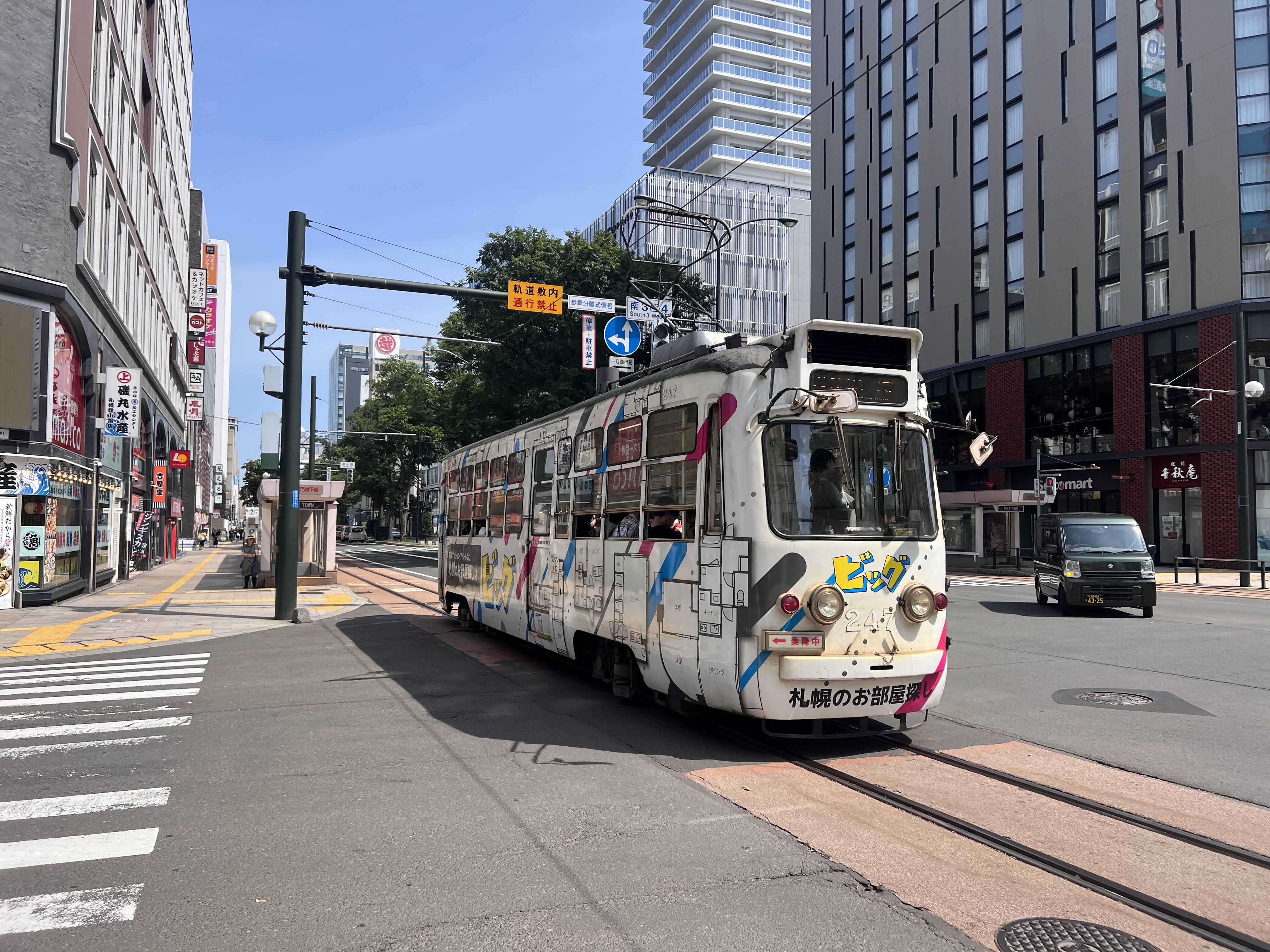 Leaving the temple and walking towards Odori Park again, I spotted the trams running through Sapporo's city center. The sight of old-fashioned trams traversing between modern buildings created a unique scene, as if time itself was flowing in a blend. Even the sound of the tram wheels on the rails felt comforting. I thought to myself that someday, given the chance, I'd love to ride one of those trams and tour the city of Sapporo.