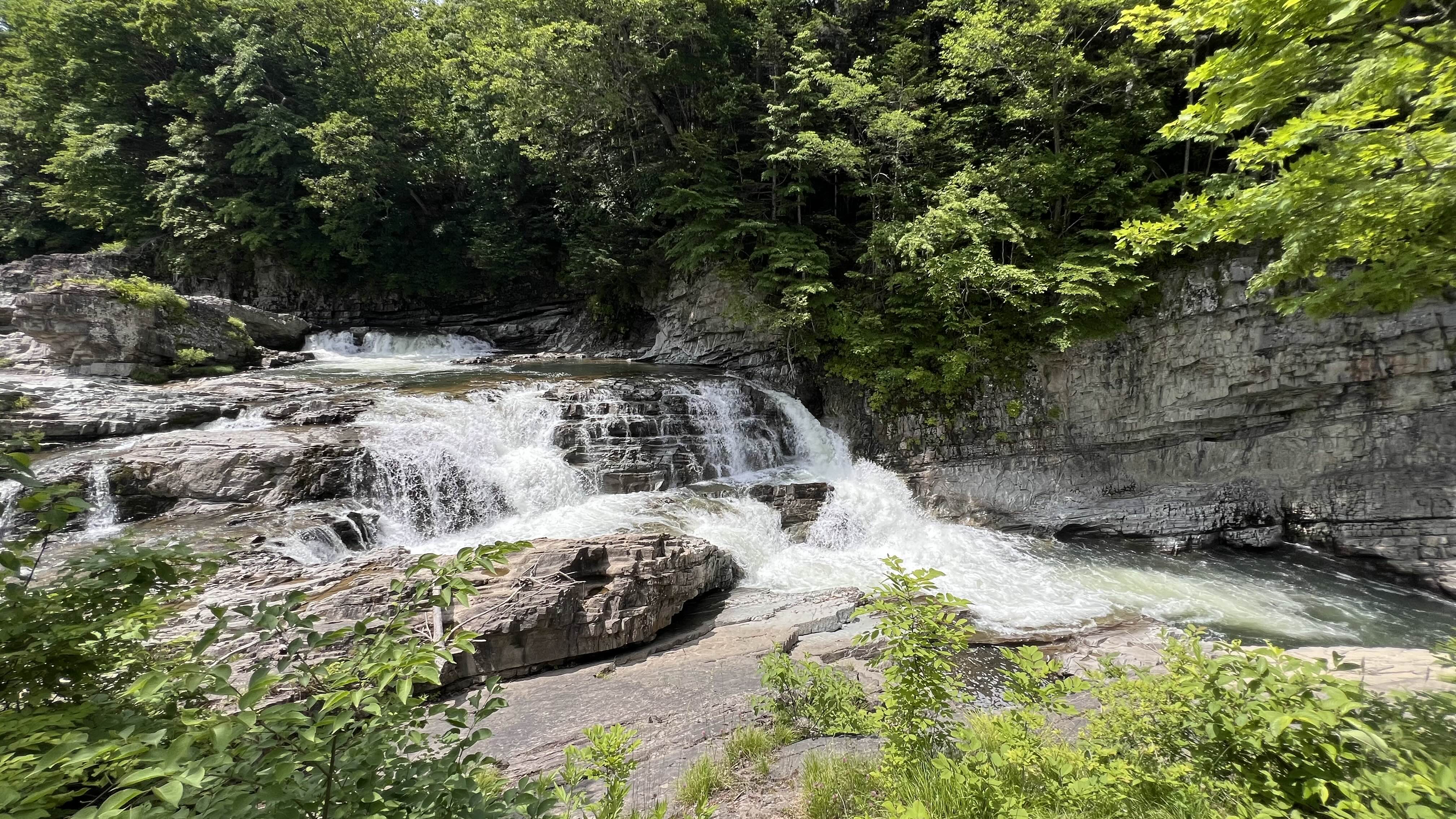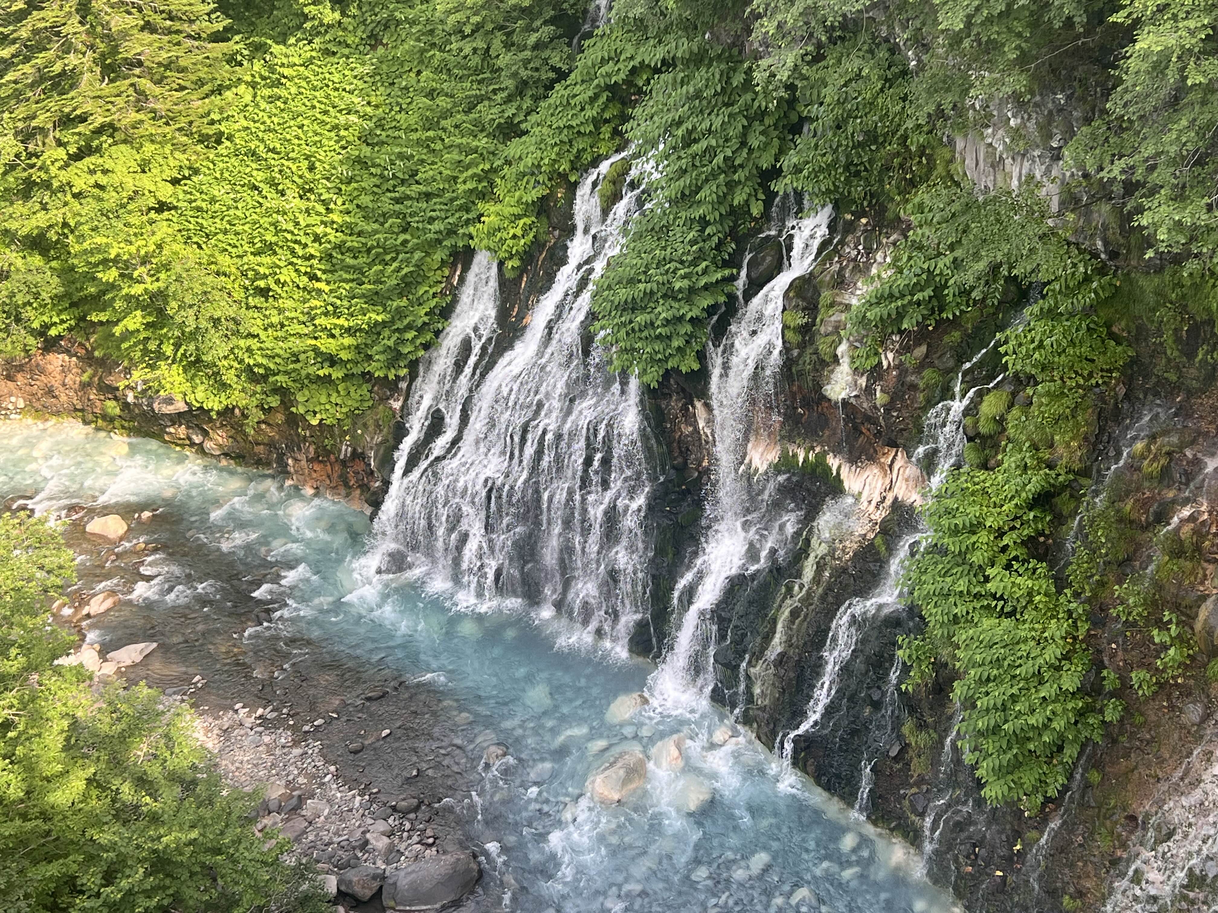 Next, I visited Shirahige Falls (白ひげの滝). Located upstream of the Biei River, this waterfall is unique in that underground water spouts from crevices in the bedrock. The bluish tint of the water was particularly striking, apparently due to the mineral composition of the surrounding rocks. Viewed from the bridge, the waterfall, blended with the surrounding green trees, created an even more mysterious atmosphere.