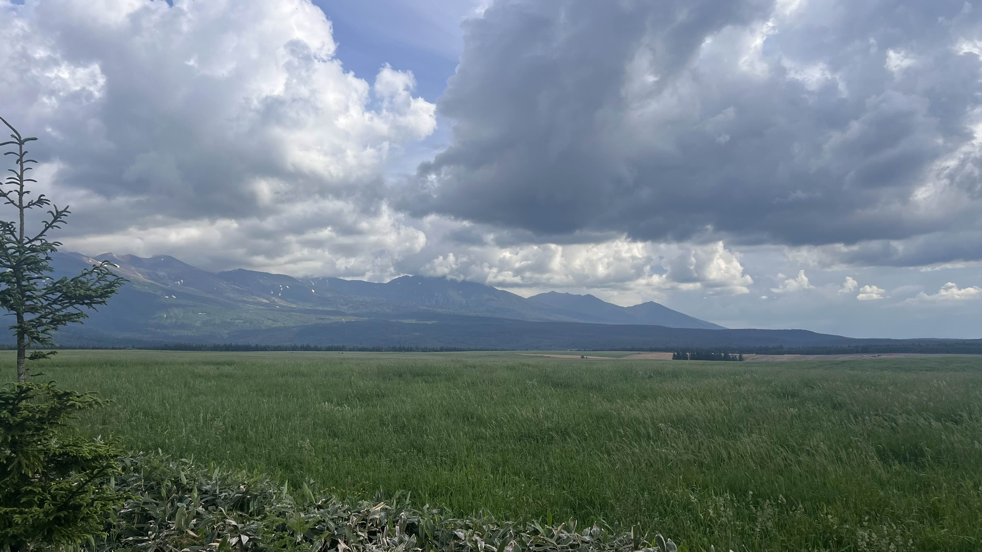 Leaving Farm Tomita behind, as I drove towards Mount Daisetsuzan, I came across a vast, unnamed grassland. A tall, solitary tree stood majestically on the wide plain, and beyond it, the imposing peaks of Mount Daisetsuzan, partially shrouded in clouds, stretched out like a folding screen. I was mesmerized by the exotic yet mystical landscape and gazed at it for a long time. It was a moment where I couldn't help but feel a deep sense of awe for the grandeur of nature.