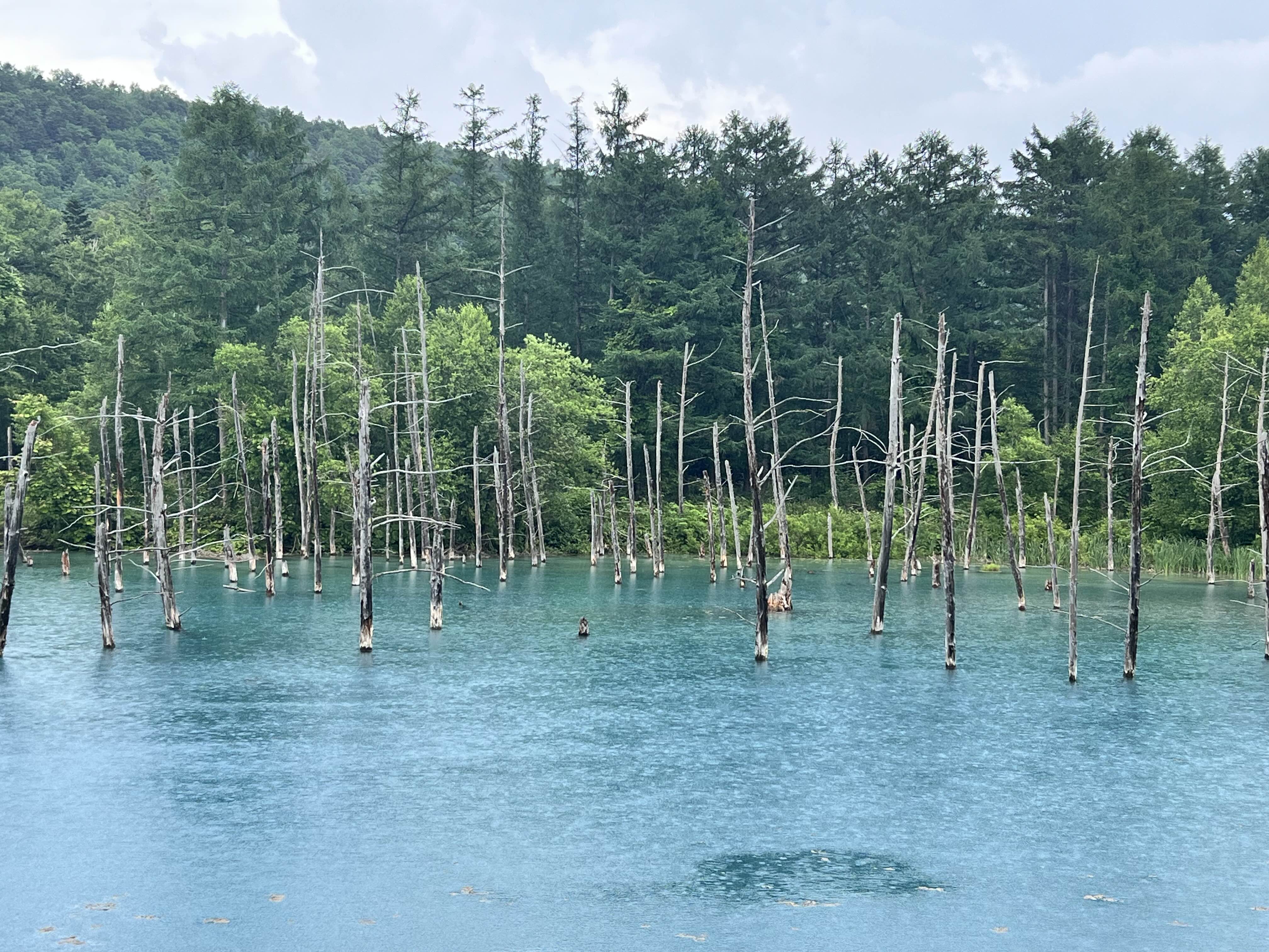 The final stop of my third day in Sapporo was the Blue Pond (青い池, Aoiike). This artificial pond, created by damming the Biei River, is famous for its fantastic cobalt blue color on clear days. The sight of bare trees standing in the pond felt like stepping into another world. The pond's color, subtly changing with the angle of light, was truly breathtaking. Although the weather was slightly cloudy on the day of my visit, I was still able to fully enjoy the unique and mysterious ambiance of the Blue Pond.