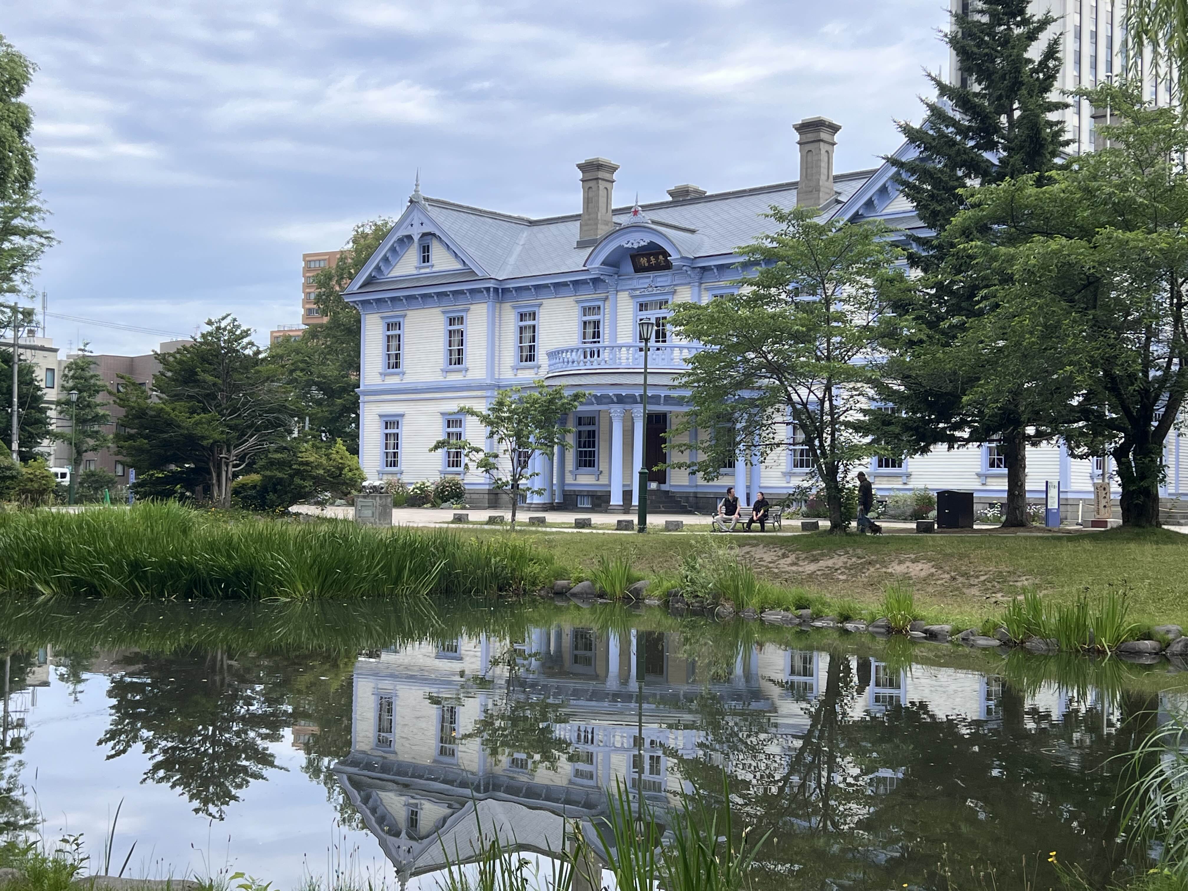 공원을 더 거닐다 보니, 고풍스러운 서양식 건축물인 풍평관(豊平館)이 모습을 드러냈습니다. 연못 건너편에서 바라본 풍평관은 파스텔 톤의 푸른색 지붕과 흰색 벽이 어우러져 그림 같은 풍경을 자아냈습니다. 그 아름다움에 이끌려 잠시 벤치에 앉아 한참을 머물렀습니다. 1881년에 지어진 이 건물은 과거 메이지 천황의 숙소로 사용되기도 했다는데, 그 역사의 흔적을 고스란히 간직한 채 삿포로의 운치를 더하고 있었습니다.