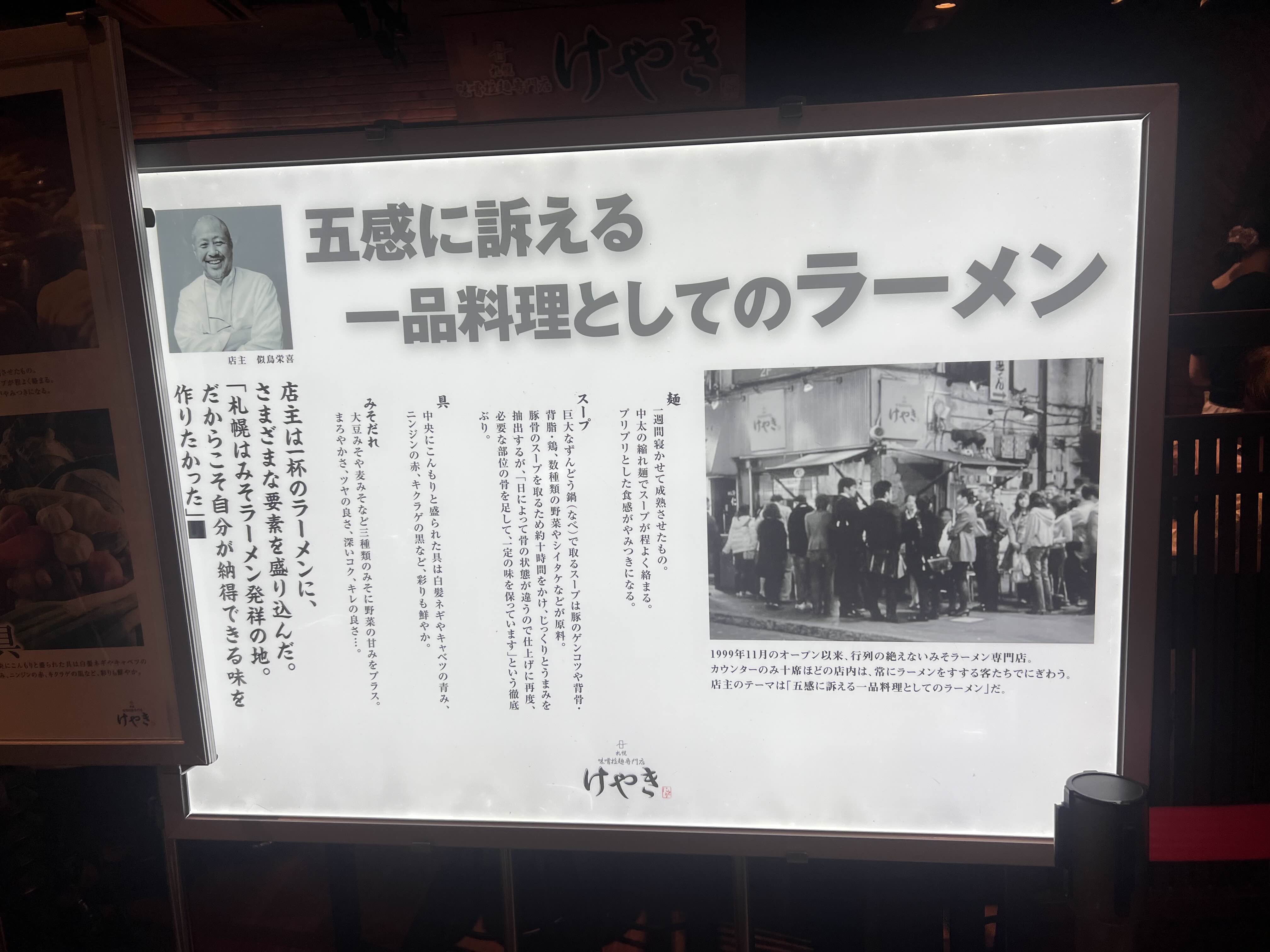 '케야키'는 신치토세 공항 국내선 터미널 3층, '홋카이도 라멘 도조(道場)'라는 라멘 푸드코트 내에 자리하고 있었습니다. 여러 라멘 전문점들이 모여있는 활기찬 공간에서, '케야키'는 특유의 구수한 미소 향으로 저를 이끌었습니다. 이미 많은 사람들로 북적이는 모습을 보니, 이곳이 단순한 공항 식당이 아님을 직감할 수 있었습니다. 특히, 매장 입구에 걸려있던 '五感に訴える一品料理としてのラーメン (오감을 자극하는 일품 요리로서의 라멘)'이라는 문구는 라멘 한 그릇에 이토록 거창한 수식어가 붙을 수 있을까 하는 의문도 잠시, 이내 그 문구의 의미를 온전히 이해하게 되었습니다. 사진 속 온화한 미소의 사장님은 마치 장인의 모습처럼 느껴졌고, 그분의 철학과 혼이 담긴 라멘이라는 설명은 제가 마주할 한 그릇에 대한 기대감을 더욱 고조시켰습니다. 한국에서 맛보았던 라멘들과는 차원이 다른 경험을 하게 될 것이라는 확신이 들었습니다.