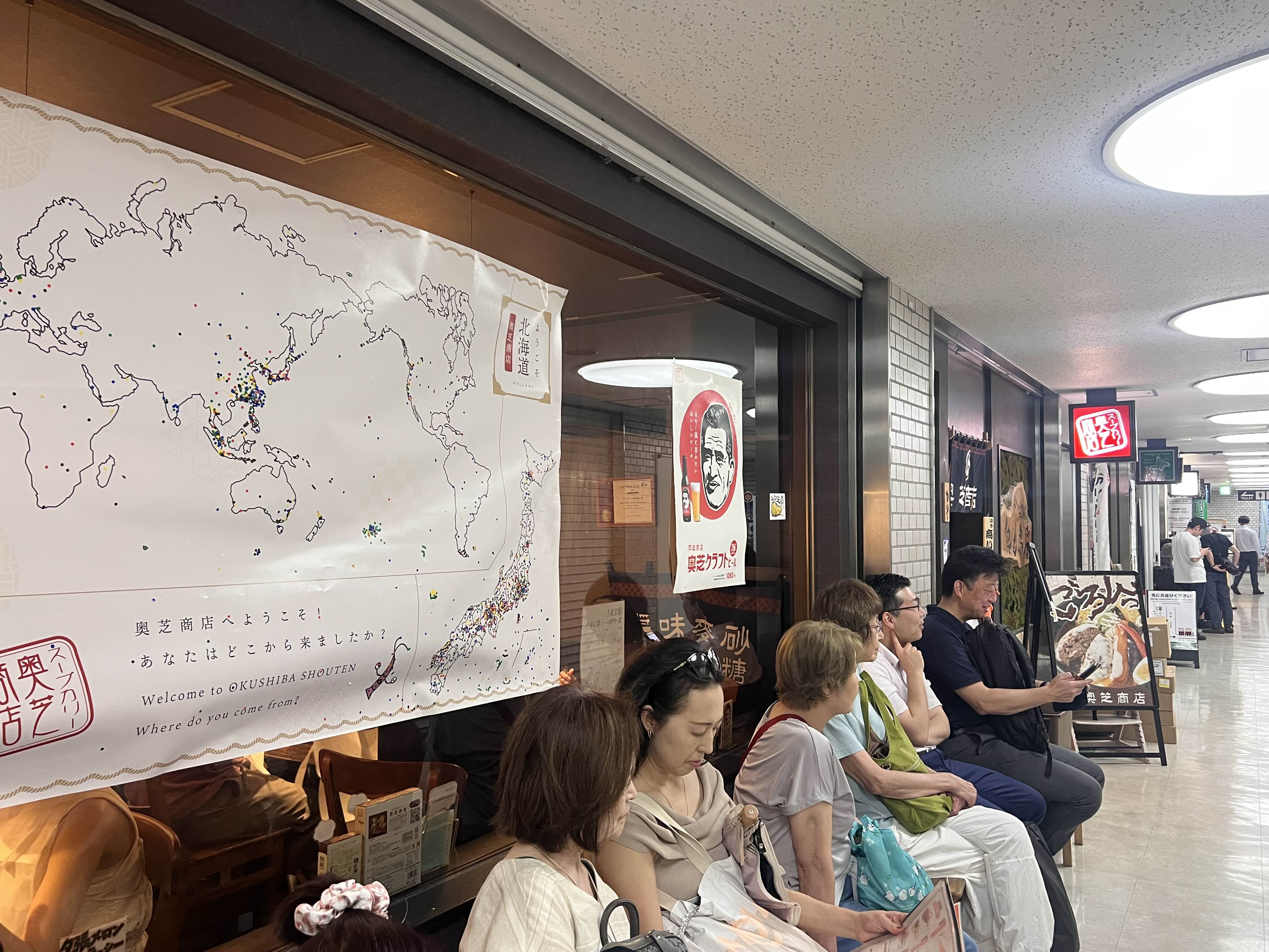 Even though it was slightly past lunchtime, quite a number of people were still lining up outside the restaurant. There were young couples, groups of friends, and families like ours, along with foreign tourists pulling their luggage. What caught my eye was the large world map on the wall next to the restaurant, densely covered with small stickers placed by visitors marking their countries of origin. Seeing this, I truly realized how much this place is loved by people from all over the world.