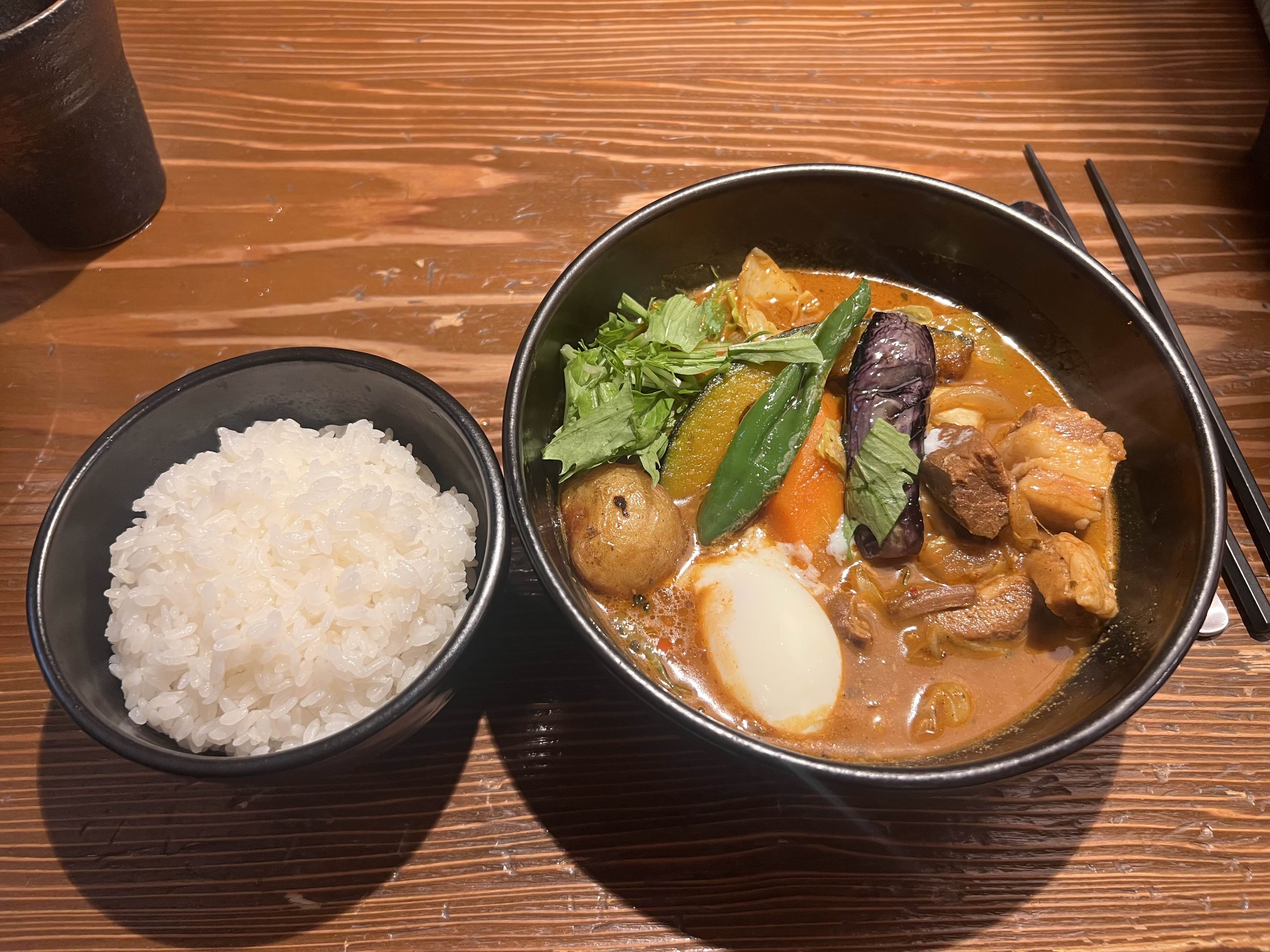 Once seated, I ordered the pork soup curry, which my daughter had highly recommended. The menu photo showed large, inviting pieces of pork along with plenty of my favorite vegetables like eggplant and pumpkin, making it look incredibly appetizing. A short while later, our eagerly awaited soup curry arrived in a large black bowl. The rice was served separately in a small bowl, and the steaming soup curry presented an truly impressive visual.