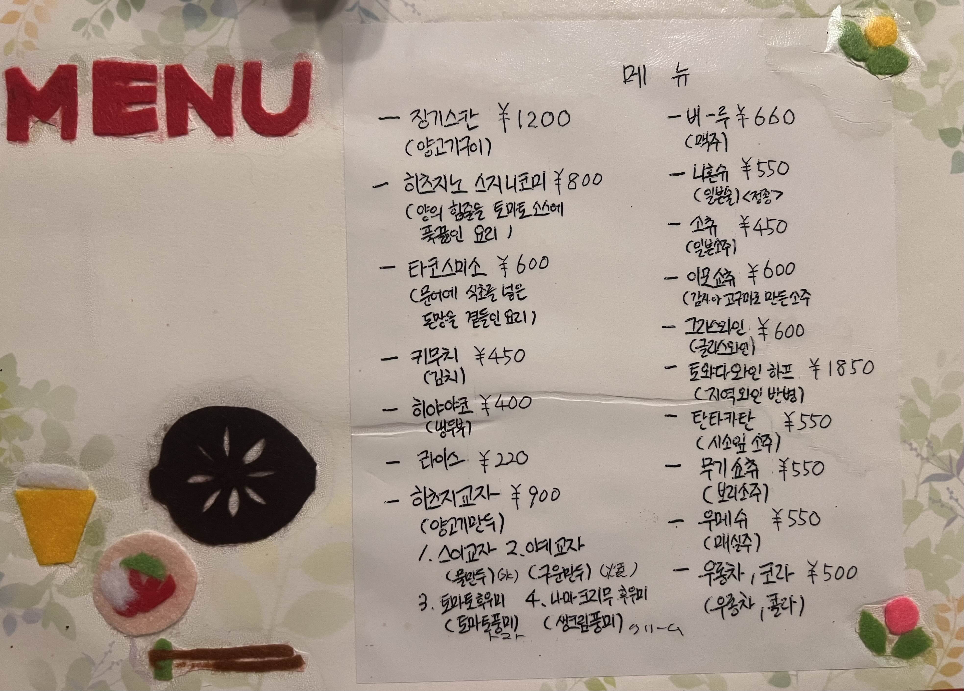 메뉴판에는 징기스칸 외에도 소박하면서도 정갈한 요리들이 가득했습니다. 해산물을 곁들인 타코스미소, 따끈한 교자, 그리고 김치까지—일본식 선술집이지만 한국의 입맛을 떠올리게 하는 소품 같은 요리들이 정겹게 느껴졌습니다.