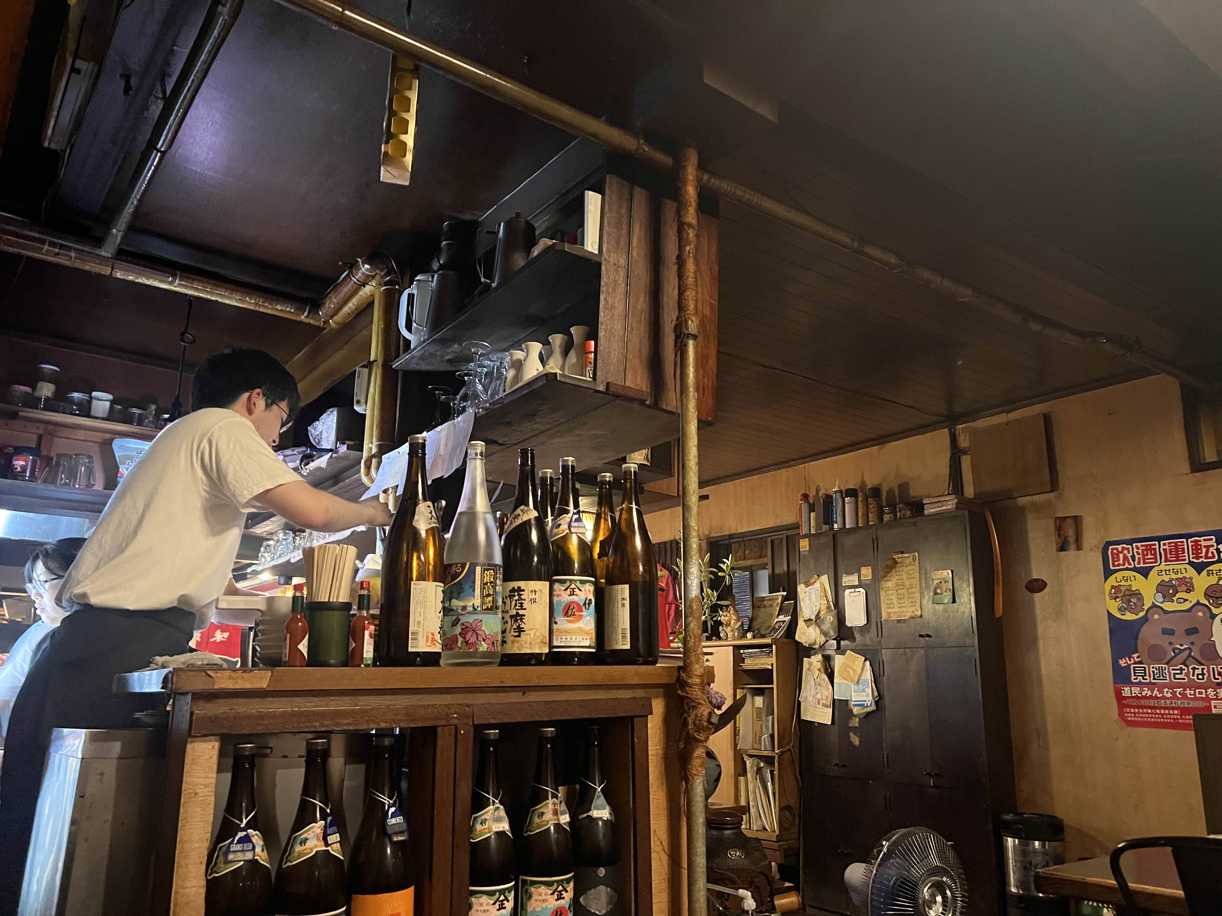가게 입구는 마치 작은 골목길 비밀 통로처럼 꾸며져 있었습니다. “AVENUE des PONPOCO CHAMPS ELYSEES”라는 독특한 간판 아래 좁은 복도를 지나 안으로 들어서니, 낡지만 정겨운 일본식 선술집의 풍경이 펼쳐졌습니다. 벽에 걸린 오래된 메뉴판, 곳곳에 붙어 있는 손글씨 메모들, 그리고 진열대 가득한 사케병들이 오랜 세월 이곳을 지켜온 이야기를 들려주는 듯했습니다.