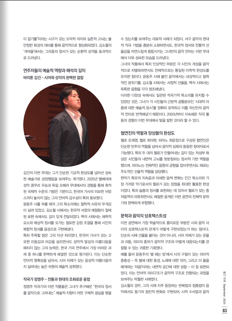 지난 8월 2일 국제아트홀에서 있었던 성악 콘서트의 느낌을 「일제강점기 시인들의 아픔이 빚어낸 슬픔의 미학 "별 헤는 밤"」이라는 제목으로 쓴 글이 이번 달 월간 리뷰에 게재되었습니다.