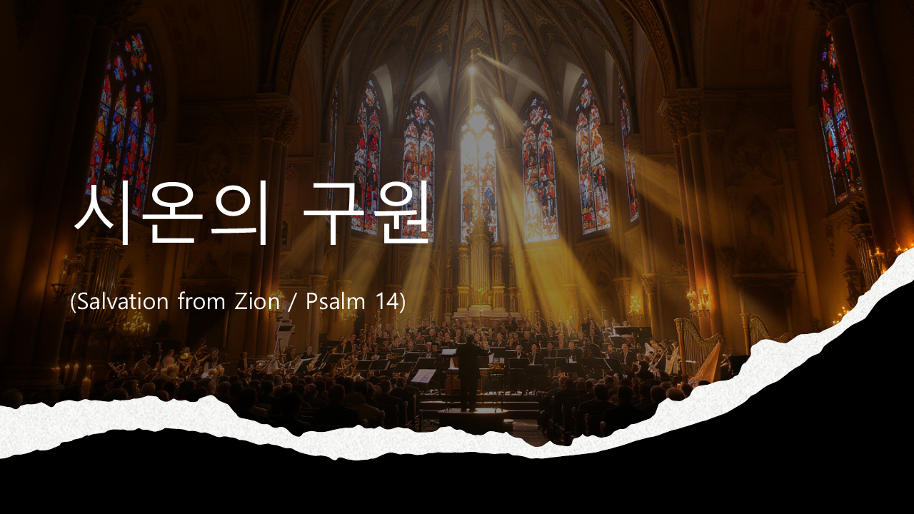 후기 낭만주의 스타일로 작곡된 시편 14편 합창곡으로 하나님의 구원이라는 극적인 서사를 음악으로 그려낸 작품입니다. SATB 혼성 합창과 풀 오케스트라, 오르간, 금관, 팀파니, 큰북, 심벌즈가 어우러져, 어둠 속에서 빛으로 나아가는 긴장과 희망의 여정을 생생하게 전달합니다.