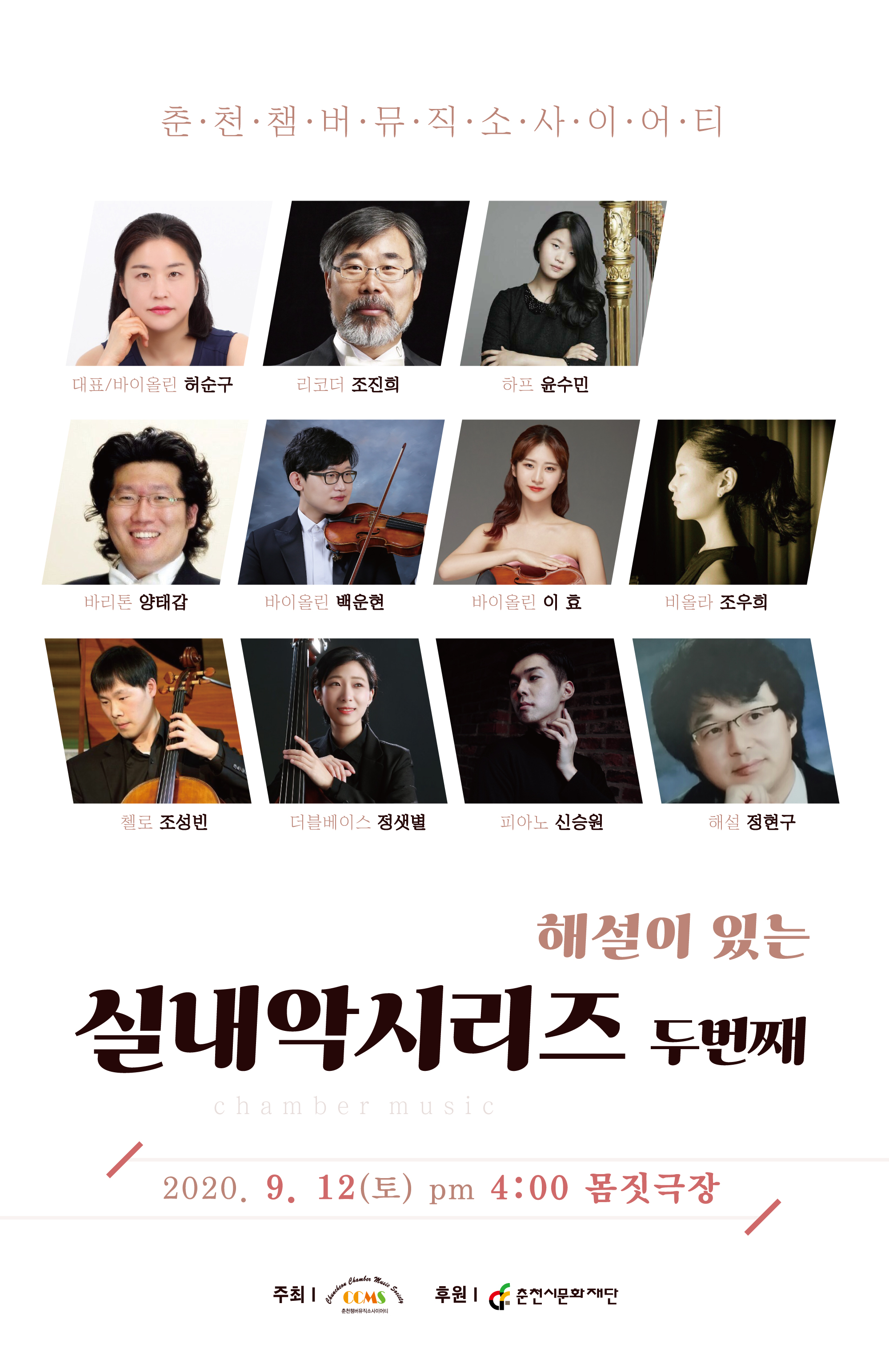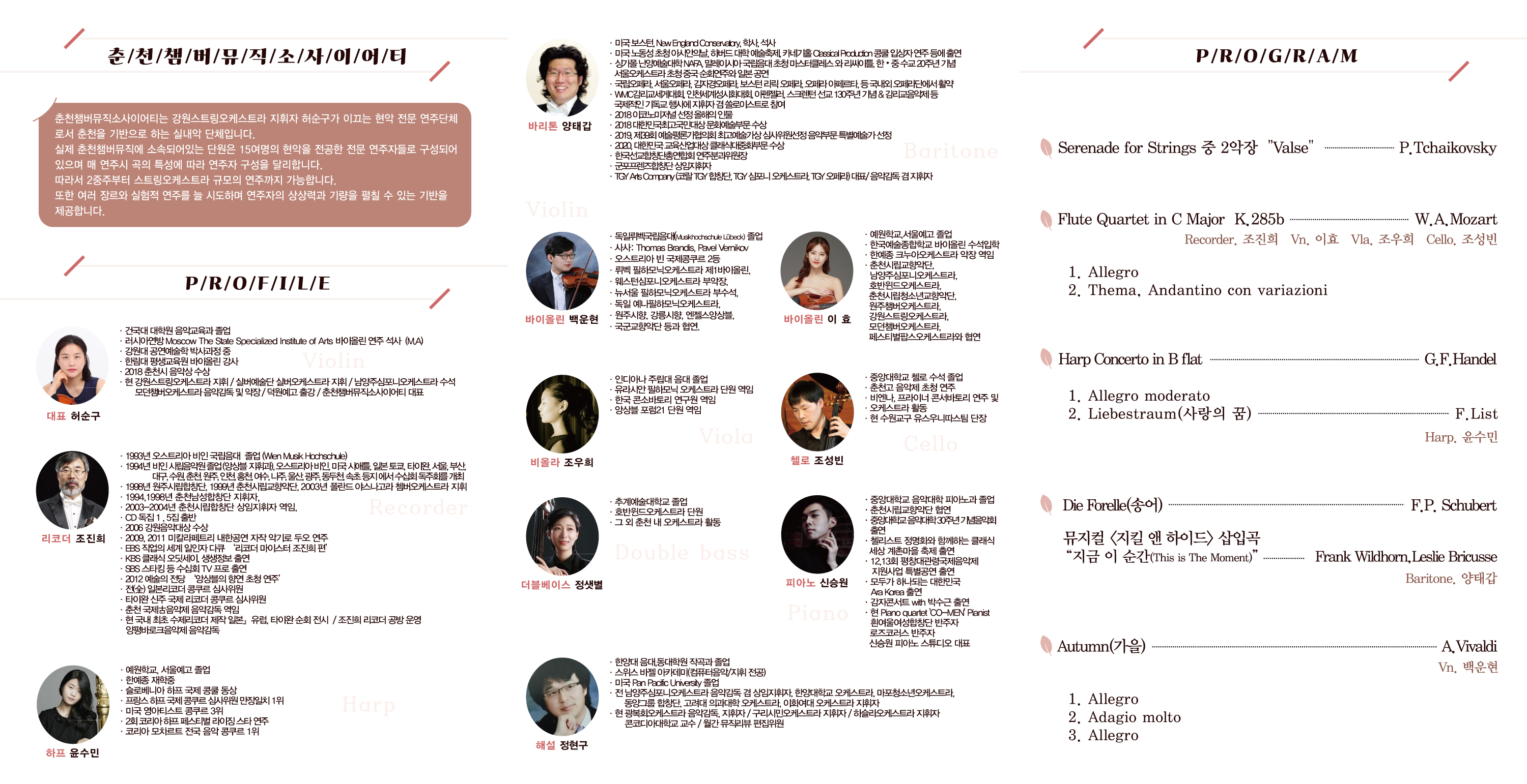 춘천챔버뮤직소사이어티가 준비한 연주회로 우리나라 최고의 리코더 연주가 조진희, 바리톤 양태갑, 프랑스 하프 국제콩쿨 심사위원 만장일치 1등 하피스트 윤수민, 비엔나국제콩쿨 2등에 빛나는 바이올리니스트 백운현과 함께하는 이번 공연은 친근한 레파토리로 해설과 함께 연주됩니다.