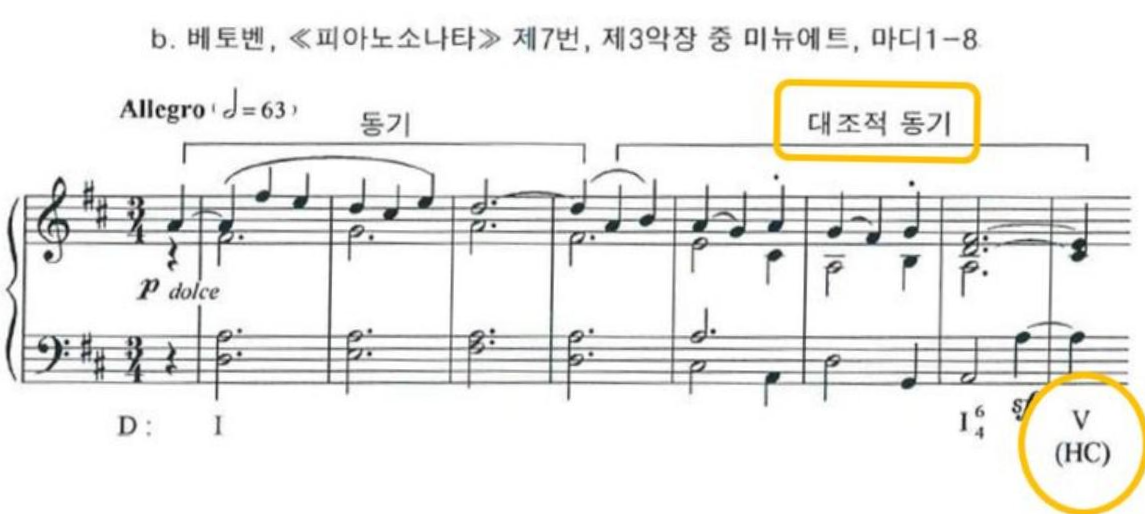이러한 대조는 앞에 나온 선행악구에 대해 뒤에 오는 후행악구는 윤곽과 리듬의 변화, 일시적인 종지를 통해 이루어질 수 있다. 이런 선율선의 변화에 인한 대조는 전체 선율에 다양성을 더 해주게 된다.