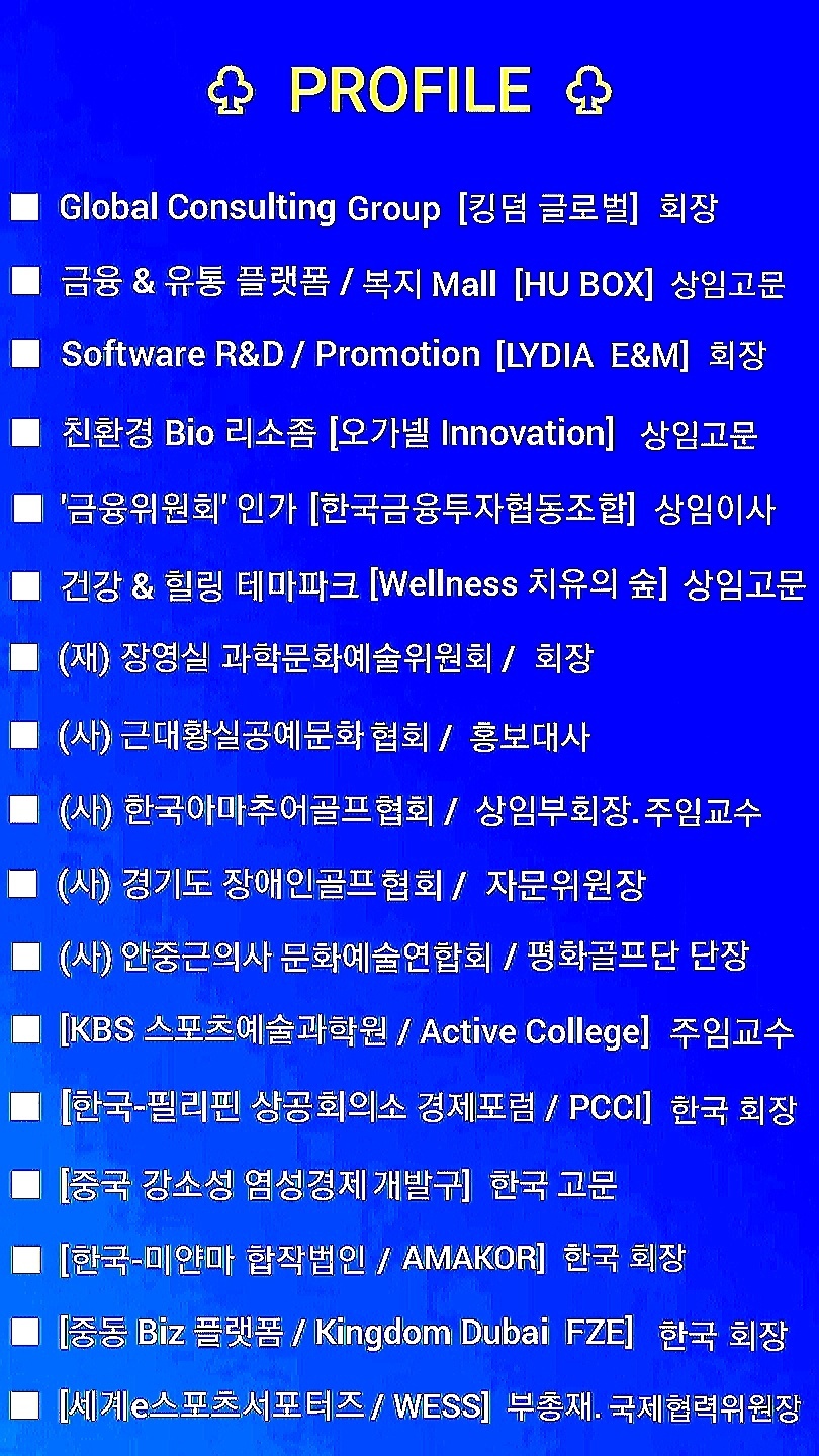 현재 국내외 여러 프로젝트를 컨설팅 하고 계시는 유 회장님은 오랜 경영 컨설팅 경험을 바탕으로 다양한 사업 아이템들을 본 조합에 접목시키고 조합 및 조합원들에 대한 비즈니스 자문 역할을 기꺼이 맡아주시기로 약속하셨습니다.