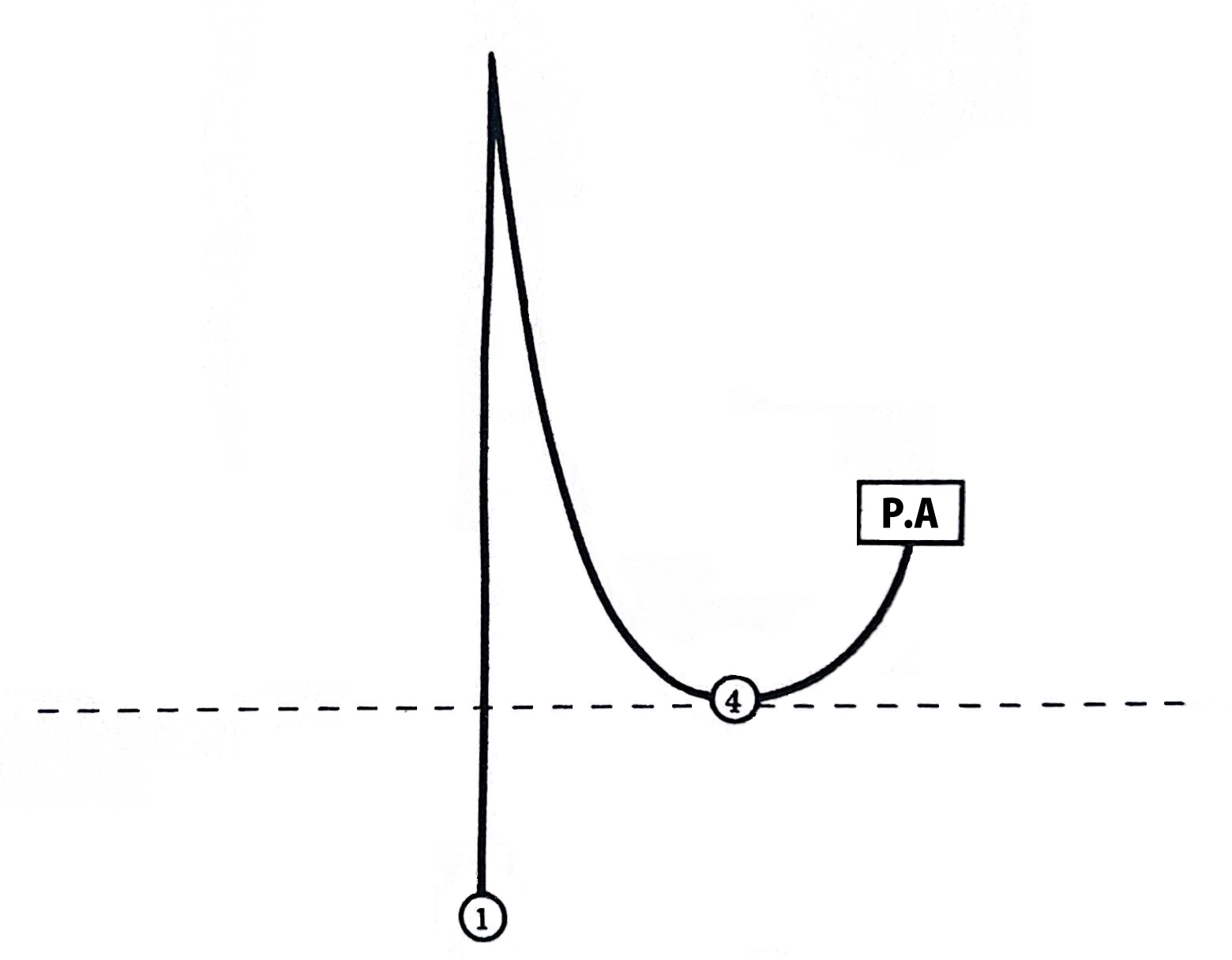 동작의 습득 이 예비자세의 효과를 더욱 올리기 위하여 팔꿈치와 팔뚝을 조금 더 위로 올려 본다. 마음속으로 박자를 헤아려서 예비동작을 일으킨다. 앞의 '논 에스프레시보(Non espressivo) 타법의 운동과 도형 3'에서와 같이 ①에 들어가 계속해서 <도표 1>의 도형에 따라 계속 몇 마디를 연습하되, 언제나 완전히 힘을 빼고 두 팔을 아래로 내린 자세부터 시작한다.
