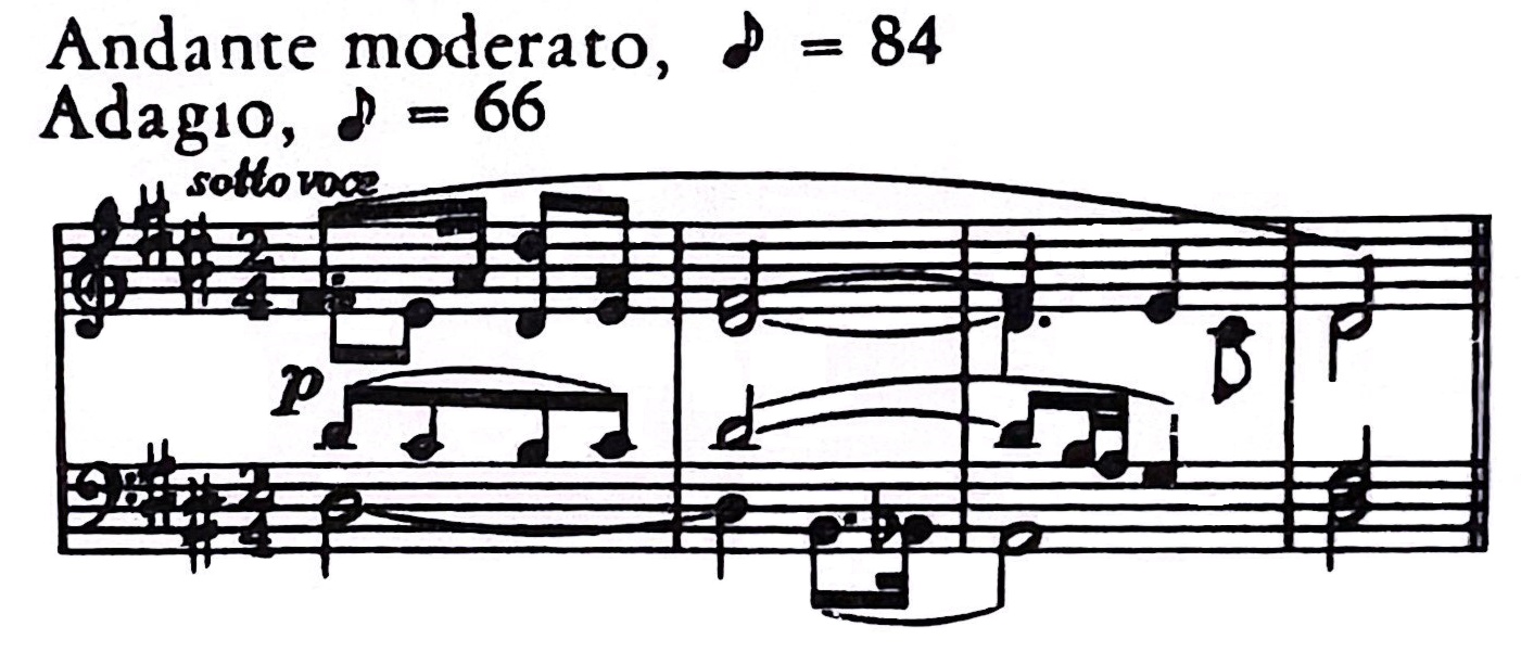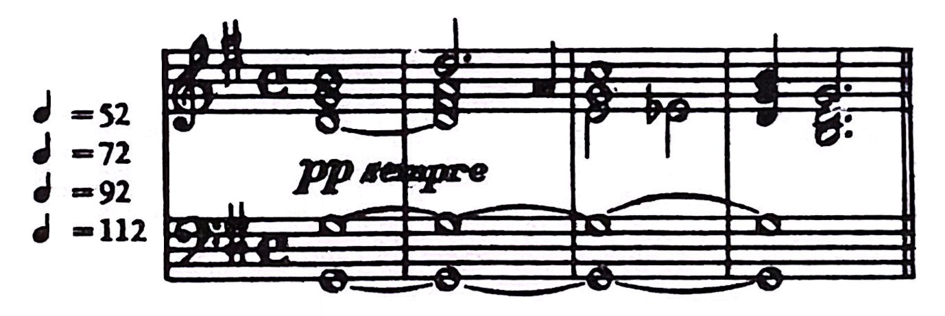 악보 예 2와 3 이 두 악보 예는 피아노로 연주하는 것으로 되어 있으나, 가능하다면 작은 편성의 합주곡으로 편곡해서 연습하는 것도 좋다. <악보 예 3>의 박자 기호는 2/4이지만 tempo가 느리기 때문에 한마디를 4박으로 지휘한다.
