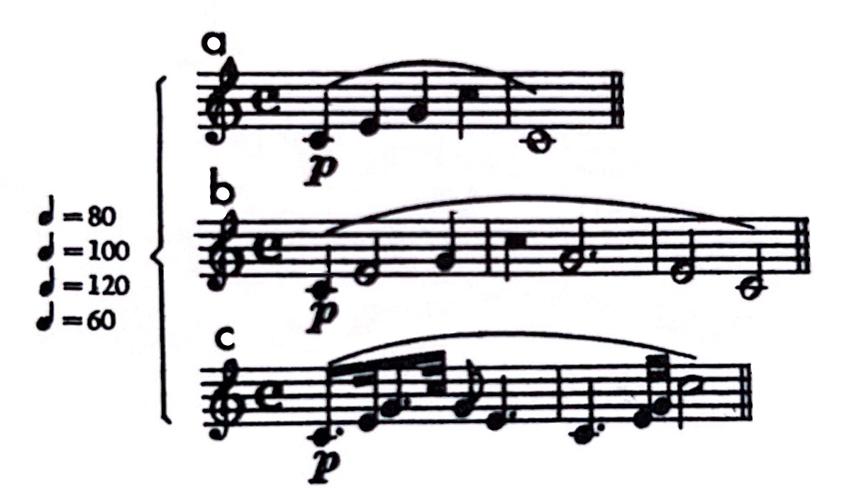 친구에게 피아노 연주를 부탁하고 예비위치 자세를 취한다. 속도에 신경을 집중하고 젓고 싶은 속도를 정확히 확인해 둔다. 준비가 끝나면 지금까지의 훈련에 준하여 <악보 예 1-a, b, c>를 연습한다. 각 악보를 연습함에 있어 메트로놈 기호로 표시한 네 가지의 tempo로 정확하게 몇 번이고 반복한다.