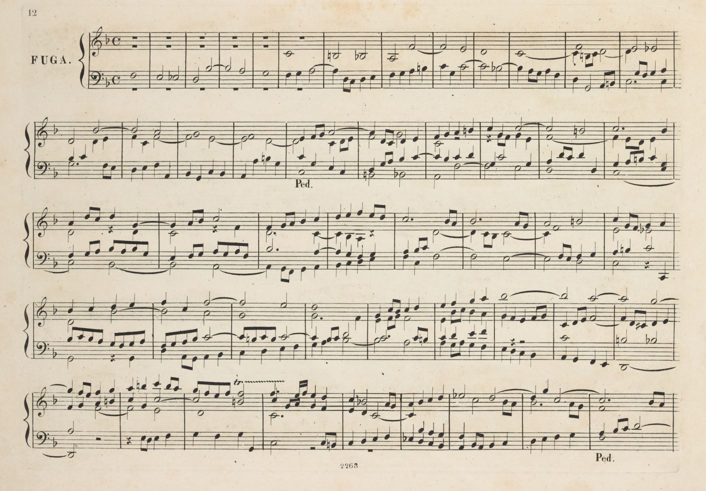 곡은 처음 6도의 도약 음정을 특징으로 하는 주제가 먼저 테너 성부에 제시됩니다. 이는 파헬벨의 같은 조의 푸가 주제를 변형한 것으로 각 성부에 걸쳐 두 번씩 나타납니다. 즉 알토, 테너, 베이스 순으로 나타나고 이것이 각 성부마다 다시 한번씩 되풀이되는데, 이렇게 제1주제의 2개의 전개부를 갖는 대목까지가 푸가의 제1부가 됩니다. 다음의 제2부는 푸가의 제2 주 제가 소프라노에 나타나고 이 딸림조의 주제는 엄정한 제1 주제에 대해 율동적인 경쾌한 느낌을 주는 밝고 즐거운 주제입니다. 이 제2 주제가 간결한 기법에 의해 전개되고 끝의 제3부는 3회에 걸쳐 양 주제가 동시에 나타나 2중 푸가다운 정교하고 다채로운 곡상을 보입니다.