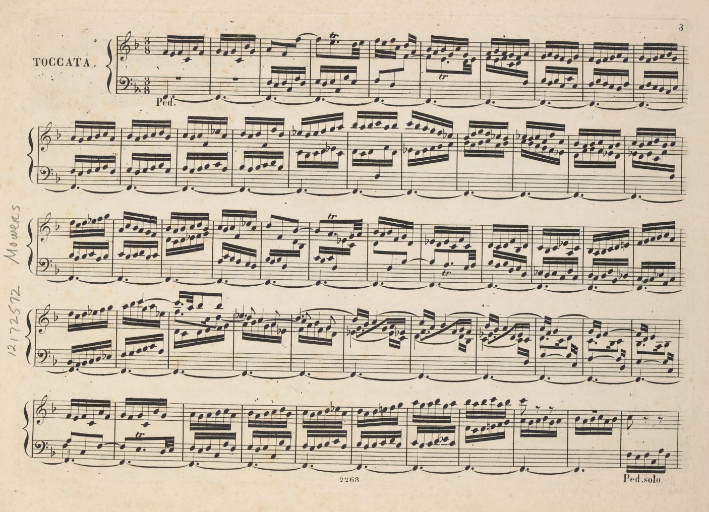 이 사이 마뉴알 즉, 손건반은 쉬게 되고 힘찬 화음과 더불어 페달이 C장조로 완전 끝마침을 하면 이번에는 같은 조에 의한 주제가 저성부에 시작되고 지금까지와는 반대로 윗성부가 이것을 쫓아갑니다. 이 사이 페달은 C음으로 계속 지속음을 내게 되어 있고, 지금까지의 과정을 되풀이 한 다음 화음에 의한 카덴짜풍의 악구가 나온 다음 다시 C장조 위에 완전 끝마침을 하고 여기서부터 토카타의 제2부로 들어가게 됩니다(악보 2). 토카타의 제2부는 새로운 주제를 각 성부가 모방적으로 취급되고 제1부와는 대조적으로 자유분방하고 격렬한 정감을 보입니다. 곡상도 대단히 풍부한 변화를 보이고 표정도 정열을 내포하면서 기분이 고조되기도 합니다.